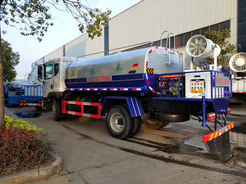 多功能抑塵車主要結構是在行走機構上加裝大容積水罐、高效遠程霧炮系統、低壓沖洗灑水系統、綠化灑水高炮(選裝,在罐體前端)、液壓系統、專用的作業和行走電控系統等改裝而成,其性能在國內處于領先水平。