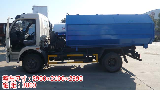 東風多利卡掛桶垃圾車,多利卡D7,白色, 軸距3800, 駕駛室2030 單排底盤,發動機CY4SK251(115kw),6檔變速箱,前后橋2.2/4.2,輪胎為7.50R16鋼絲胎,動轉,斷氣剎,離合助力,ABS。