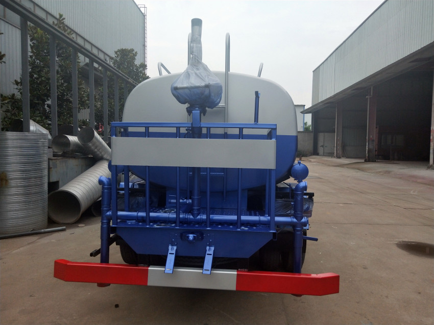該灑水車具有前沖后灑、側(cè)噴(更換噴頭后變?yōu)閭?cè)花灑)、后置式工作平臺(tái)(帶踏梯,四周有安全護(hù)欄)、平臺(tái)上設(shè)置有高壓水炮(可360°旋轉(zhuǎn),可調(diào)成柱狀射程28米,也可調(diào)成霧狀射程14米,可調(diào)成:直沖狀、大雨、中雨、小雨、毛毛雨),整車灑水寬度大于14米.配備優(yōu)質(zhì)大功率專用灑水泵,取力器,雜物過濾網(wǎng),國(guó)標(biāo)通用65型消防接口(可通過消防栓加水)、1套自流球閥系統(tǒng)(可自吸自排,吸程6米),2根引水鋼絲膠管(帶陰陽快速接頭),配鎖,水位計(jì),作業(yè)高音喇叭.兩側(cè)及后加強(qiáng)型保險(xiǎn)杠,防滑爬梯,膠管儲(chǔ)存筒.