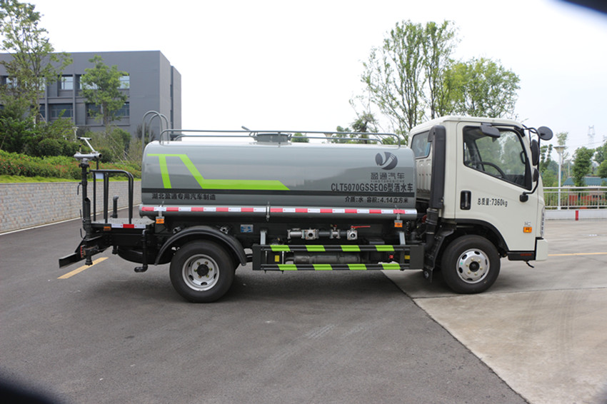 5立方灑水車專用配置:罐體標準容積5.0立方,采用4mm**碳鋼板,罐內制作減震波浪隔板,以減輕汽車行駛時罐體液體沖擊,配置灑水車水泵,可泵進泵出,安裝前沖、后灑、側噴、灑水平臺、灑水高炮(可360度旋轉,可調節直流、大雨、小雨、毛毛雨、霧狀),前封頭帶水位計,后平臺主管路帶1寸澆花接口,后爬梯,平臺后部帶小安全告知牌:“隨時停車,注意安全”,配置兩根三米的吸水管,電子音樂喇叭,及消防接口。罐體顏色:銀灰/銀藍,或上白/下藍,罐體兩側噴“灑水車、綠化灑水車”字樣,貼反光標示。灑水寬度≥12米,高炮射程≥25米,垂直吸程≥6米。