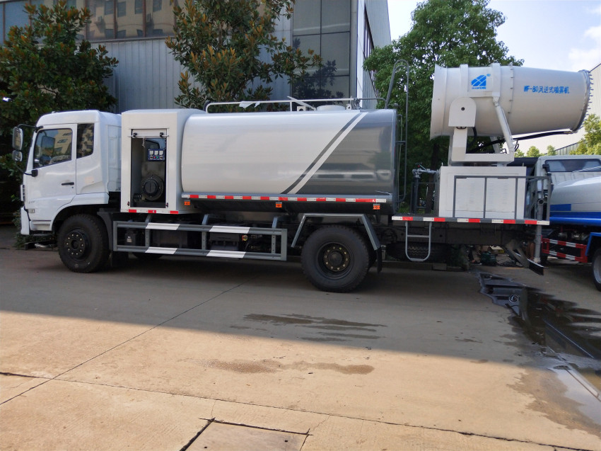 霧炮車是防污降塵的一種先進設備,可將灌裝水以高壓驅動形成強大噴霧,噴灑至空中,風炮射程達到100米,噴霧流量可達80L/min,噴灑范圍廣,凈化空氣能力強,具有強大的噴灑功效,且具有前沖、后灑,左右噴灑等多種功能抑塵和清潔空氣的車輛