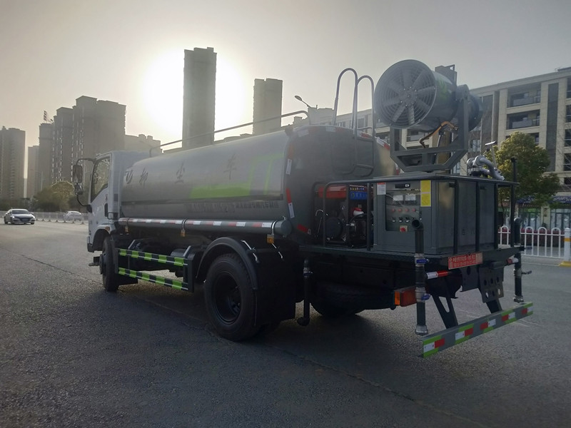 1、灑水車前裝有鴨形噴嘴或圓頭沖嘴,后面裝有圓柱開灑水噴嘴或蓮蓬頭噴嘴,后部有一工作平臺,裝配有水炮。后部還可裝8個噴嘴(選裝);
