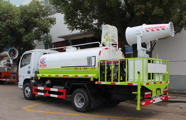 5方灑水車上裝配置:罐體容積5噸,方圓形罐體,罐體鋼板采用Q235碳鋼鋼材,整車具備灑水車的一切功能(前沖、后灑、側噴、平臺高炮),標配億豐40/50水泵,自流閥及消防接頭各1個、水管2根。后平臺安裝一臺30米霧炮。