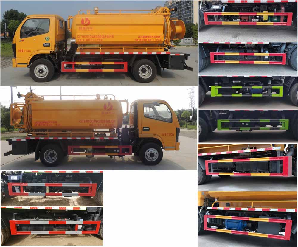 5方清洗吸污車-5方管道搜通車該車用于下水道排污及疏通,專用裝置:罐體及清洗吸污裝置;罐體外形尺寸(直段長×直徑)(mm):3100×1300(前部1300mm為清水罐,后部1800mm為污水罐);污水罐總容量:2.1立方米,污水罐有效容積:2.0立方米,介質:液態污物,密度800千克/立方米;清水罐總容量:1.68立方米,清水罐有效容積:1.6立方米,介質:水,密度1000千克/立方米,清水罐和污水罐為獨立罐體,清洗功能時用清水罐,吸污功能時用污水罐,污水罐和清水罐不可同時滿載;ABS型號/廠家:ABS/ASR-12V-4S/4M/襄陽東風隆誠機械有限責任公司;卸料方式為舉升后卸式;側、后防護材料均為:Q235碳鋼,連接方式均為:螺栓連接,后部防護截面尺寸(mm):120×50,后部防護離地高度(mm):370.隨底盤選裝駕駛室,選裝底盤附件安裝位置.選裝燃油箱,電瓶,尿素罐,儲氣筒左右安裝位置