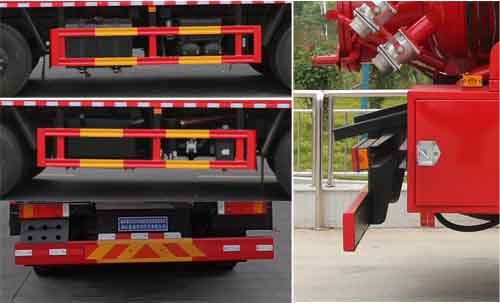 選裝罐體側面樣式;ABS型號:3631010-C2000;ABS生產企業:東科克諾爾商用車制動系統(十堰)有限公司;選裝描述:隨底盤選裝駕駛室,選裝罐體后部樣式;側后防護情況:側、后防護材料均為Q235碳鋼,連接方式:螺栓連接。后防護截面尺寸(mm)200×60,下邊緣離地高480mm;污水罐總容量14.6立方米,污水罐有效容積13.9立方米,介質:液態污物,密度:800千克/立方米;清水罐總容量11.68立方米,清水罐有效容積11.12立方米,介質:水,密度:1000千克/立方米,罐體尺寸為(直段長×直徑)(mm):7100×2350(前部3150mm為清水罐,后部3950mm為污水罐);專用功能及裝置:該車用于清洗吸污,主要專用裝置為罐體及清洗吸污裝置;其他說明:兩罐獨立,且不能同時滿載,清洗功能時用清水罐,吸污功能時用污水罐,卸料方式:舉升后卸;選裝前部不帶卷簾門保護箱。,隨底盤選裝儲氣筒、蓄電池位置。