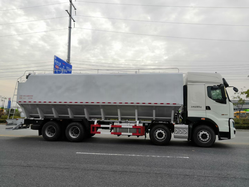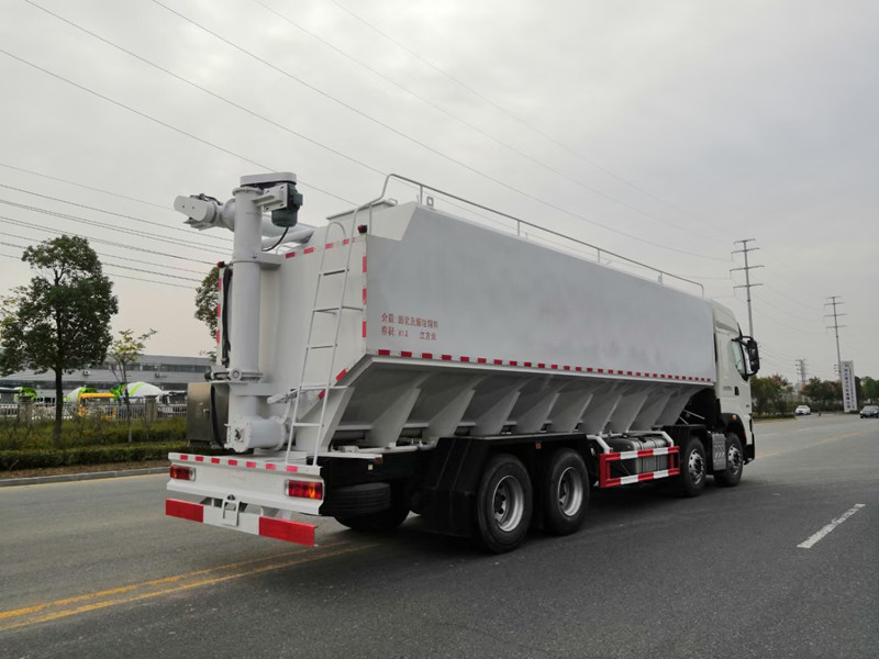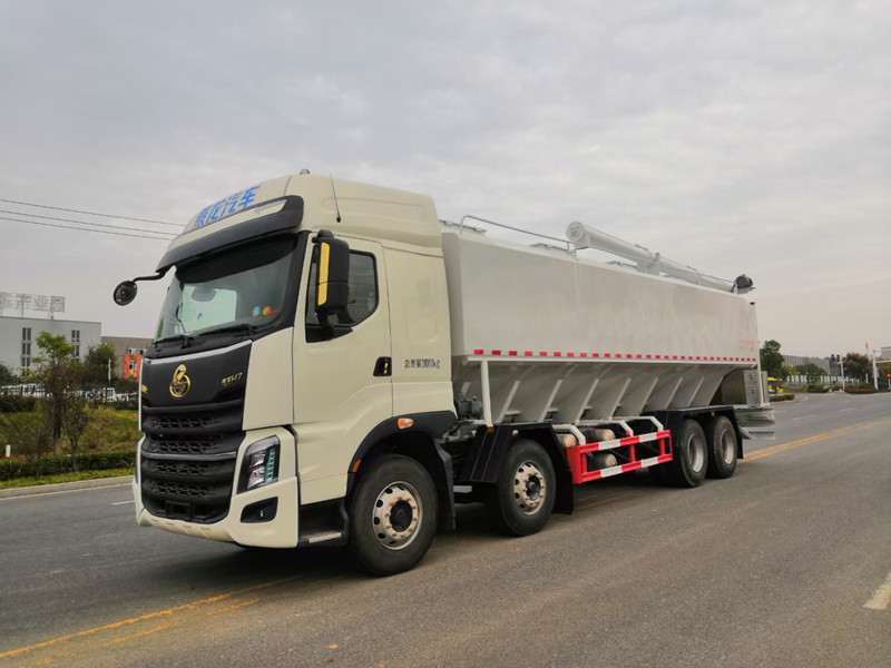 柳汽乘龍前四后八散裝飼料運輸車/40方養殖場飼料配送車整車型號:XBZ5310ZSLL6,柳汽H7駕駛室,玉柴460馬力國六發動機,法士特12檔鋁合金變速箱,5.5T雙前橋,440雙后橋,12R22.5,全氣囊懸浮駕駛室,電動玻璃、LCD液晶儀表、自動空調、真皮多功能方向盤、定速巡航、ABS、中控鎖、自動調整臂。整車尺寸:12000×2500×3995mm。/40方散裝飼料車