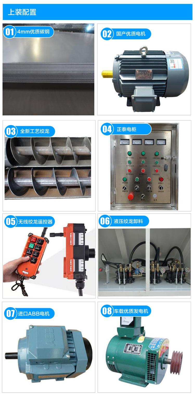 飼料車卸料裝置:外接380 V 電源, 外接電源成本低,環(huán)保,車輛損耗小, 卸料每分鐘500-700 Kg ,4 個5.5級進口西門子電機,