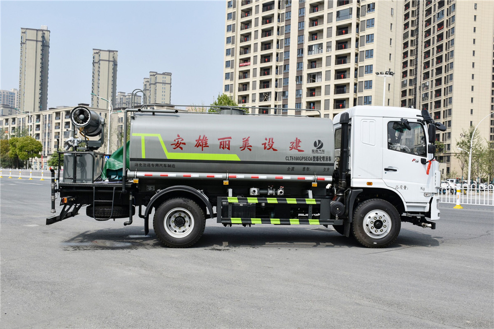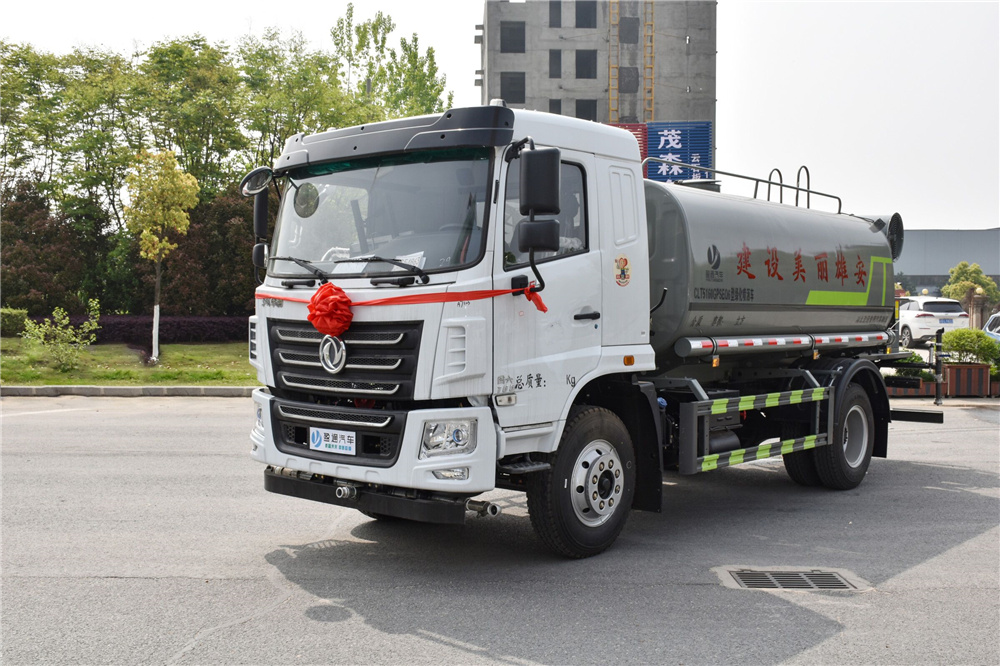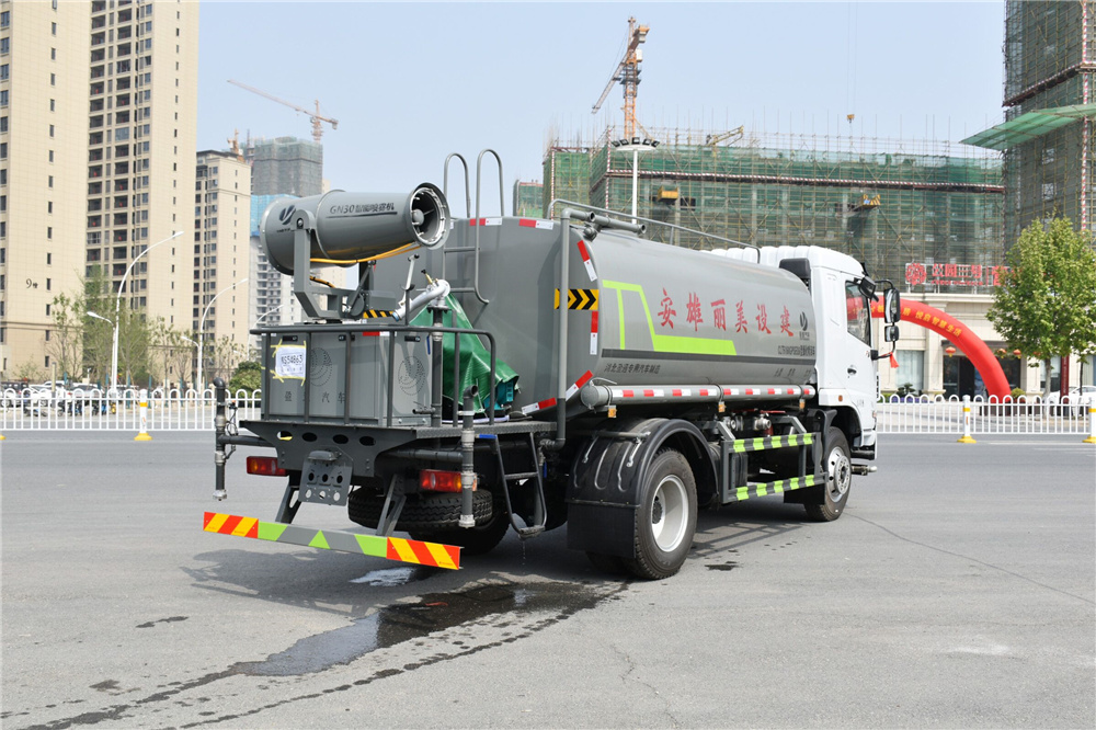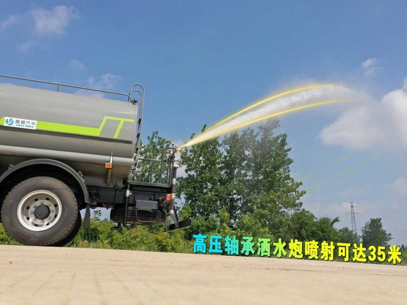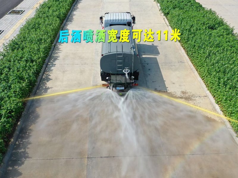 灑水車專用功能配置:罐體實際容積約為12立方米,(罐體有效參數9.79立方米、額定載質量9325kg、)采用武鋼優質碳鋼板卷壓成型。配備專用灑水泵,自吸自排,前噴后灑、側噴、后工作平臺及灑水高壓炮。灑水泵自吸高度為6米左右,整車灑水寬度14米左右,后工作平臺水炮可調成:直沖狀、大雨、中雨、小雨、毛毛雨,有效射程≥28米,整車帶接頭、水位計,自流閥。后工作平臺主管路帶1寸澆花接口,附送2根3米水管,1個爬梯,兩側及后保險杠。