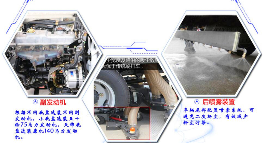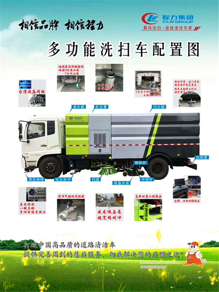 東風8方洗掃車采用東風型國五二類底盤改裝,加裝副發(fā)動機、風機、高壓水泵、清水箱、垃圾箱、左右立掃、帶噴水桿的寬吸嘴、低壓沖洗系統(tǒng)、垃圾箱自潔,掃盤降塵系統(tǒng),液壓系統(tǒng)、專用裝置電控系統(tǒng)和副車架等改裝而成: