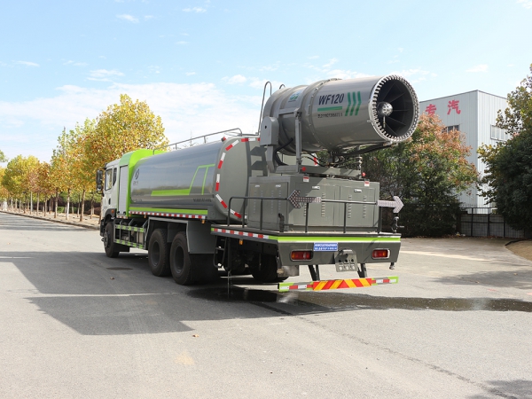 東風大型灑水車-抑塵車上裝配置: 1、罐體約為 17 方,可加裝 60-120 型霧炮 2、邊燈帶電,罐體尾部上方標配 2 個紅色示寬燈, 3、標配前噴為鴨嘴直沖,標配后沖,用戶可根據(jù)自己的需求,來調 整對沖位置。