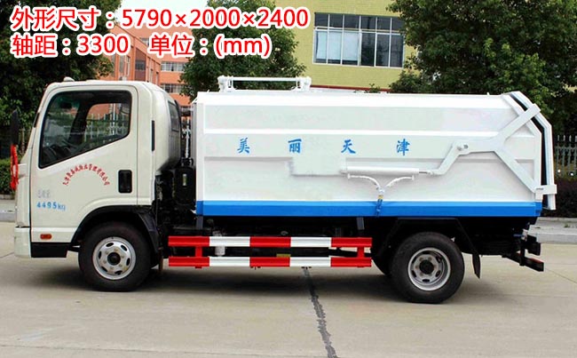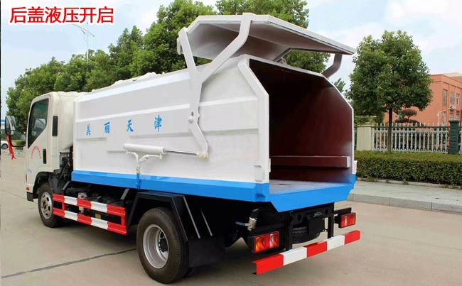 箱體容積5~6立方米,外形與掛桶垃圾車相似,箱體材料邊三底四碳鋼,內(nèi)部做防銹處理,側(cè)方帶掛桶提升機(jī)構(gòu),車尾部橡膠密封條,內(nèi)置推板,后蓋液壓開啟。