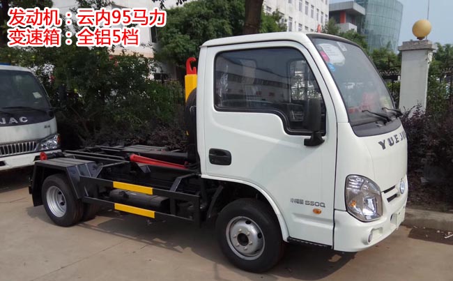 躍進小福星勾臂式垃圾車,上汽躍進底盤,云內德威95馬力,柴油發動機,全鋁5檔變速箱,軸距2.8米,輪胎型號185R14重型后雙胎,前盤制動。