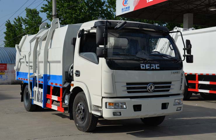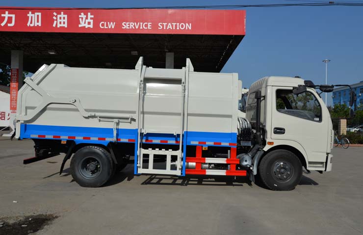 容積6~8立方米,箱體采用Q235碳鋼材質(zhì),箱體右側(cè)配液壓掛桶提升機(jī),可掛國標(biāo)120升+240升塑料垃圾桶,駕駛室外部手動操作,鐵通掛架;后門鎖緊為機(jī)械鎖緊,手動開啟;相同結(jié)構(gòu)為槍版形式。