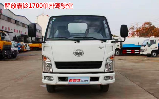 解放霸鈴掛桶式垃圾車,解放霸鈴1700單排駕駛室,錫柴490發動機、95馬力,臨工5檔變速箱,6.00-15輪胎,單層局部加強大梁,帶動力轉向,電熄火,24V電瓶,電調收音機,MP3,帶有ABS,斷氣剎。