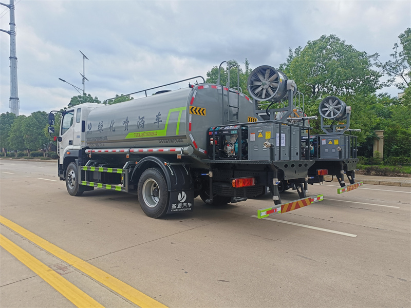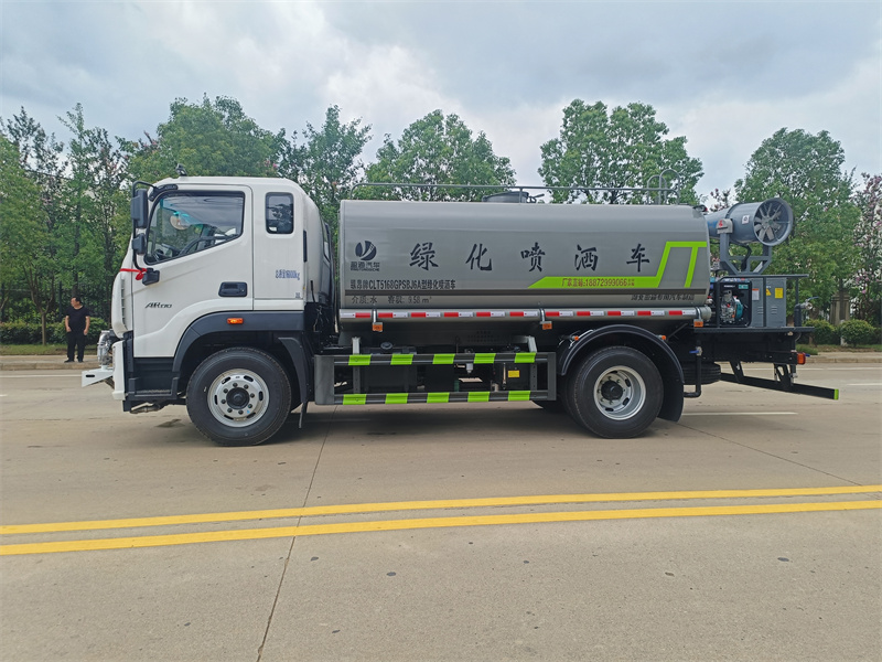產品簡述:縱昂牌 CLT5188GPSEQ6A 型綠化噴灑車標配前噴(鴨嘴)、后對沖、 后灑、側噴、后置式工作平臺,平臺上配置綠化水炮(可 360°旋轉,既可以調 成柱狀,也可以調成霧狀),配備優質大功率專用灑水泵(可自吸自排,可從河 里或池塘抽水到罐體),取力器,雜物過濾網,消防接口,自流球閥系統、取力 器、球閥、濾網均為國家標準產品,主管道加粗,法蘭墊、法蘭盤加厚,大通徑 球閥。整體具備性能優良安全可靠、效率高、流量大、維修方便等特點