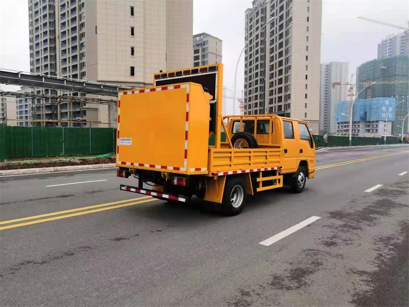 上裝配置:防撞緩沖車尾部設(shè)置防撞緩沖塊,防撞緩沖塊采用液壓升降裝置,還配備車載一體化的電子屏、電子箭頭標志牌、頻閃燈及爆閃燈多種警示燈,能夠為后方車輛提供警示和指示方向。箭頭指示標志可對左、右及禁止通行進行導向指示,對道路車輛提供主動安全引導和安全警示,最大限度降低施工對交通流量的影響并確保安全。尾部升降和燈具采用遙控控制,可在車輛附近安全控制防撞緩沖塊的升降和警示燈的開關(guān)。