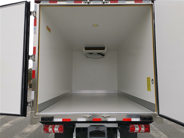 江淮帥鈴E 4米2冷藏車廂體配置為:采用斷橋隔熱工藝,整體框架結構制作,廂體內、外壁材料為玻璃鋼板,采用高密度保溫層,廂板內帶有骨架,廂體厚度80mm,門框,門飾件、包角全部使用不銹鋼材質。最新款鋁合金包邊型材,廂體內采用LED照明燈及廂體示寬燈;門框密封條為橡膠材質,后門梁帶加厚防撞塊,加厚型不銹鋼鉸鏈及鎖件。車體副梁采用510L高強度鋼制作,底板為鋁花紋板,車廂后門帶一個上車扶手,其余標配;