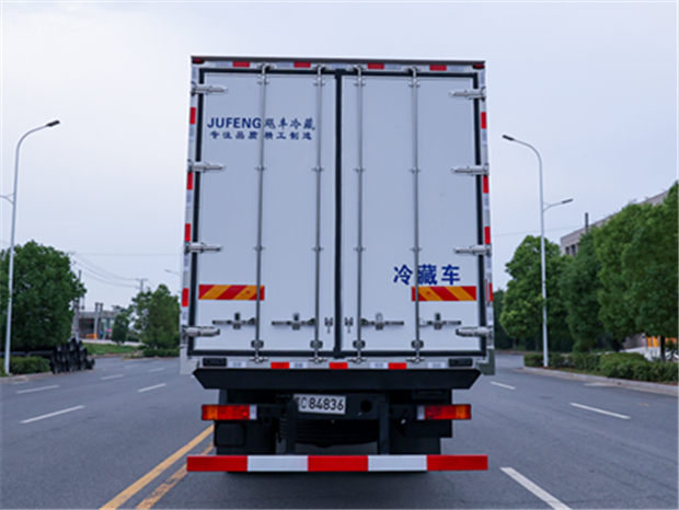 東風天錦8米6冷藏車廂體配置為:斷橋隔溫工藝,整體結構框架,內外面料為3mm新款啞光玻璃鋼夾保溫層真空復合而成,廂體厚度為8cm,最新款鋁合金包邊型材,型材局部厚度為4mm(鋼制鉚釘加固),廂體內部采用2個LED照明燈及廂體示寬燈,后門框不銹鋼材質,門框密封條為三元乙丙橡膠材質,加厚型不銹鋼合頁及鎖件;副梁為Q700車用大梁鋼,15mm厚大梁墊皮,加裝防撞膠塊,不銹鋼門鎖件,配后雙開門,副駕駛一側居中靠前開單側門一個,帶2個排水孔。