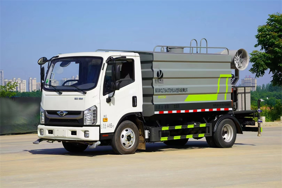 福田7方藍牌霧炮灑水車產品簡述:縱昂牌 CLT5043TDYBJ6 型多功能抑塵車標配前噴(鴨嘴)、后對 沖、后灑、側噴、后置式工作平臺,平臺上配置綠化水炮(可 360°旋轉,既可 以調成柱狀,也可以調成霧狀),配備優質大功率專用灑水泵(可自吸自排, 可從河里或池塘抽水到罐體),取力器,雜物過濾網,消防接口,自流球閥系統、 取力器、球閥、濾網均為國家標準產品,主管道加粗,法蘭墊、法蘭盤加厚, 大通徑球閥。整體具備性能優良安全可靠、效率高、流量大、維修方便等特點。