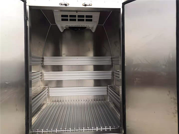 福特全順汽油版疫苗冷鏈車車廂配置: 保溫廂內(nèi)板為304不銹鋼板,夾保溫層制作,廂體底板和四周廂板安裝通風(fēng)槽。廂內(nèi)帶LED照明燈,溫濕度顯示記錄儀,紫外線消毒燈,外場照明燈燈配置。不銹鋼門框,鎖件。