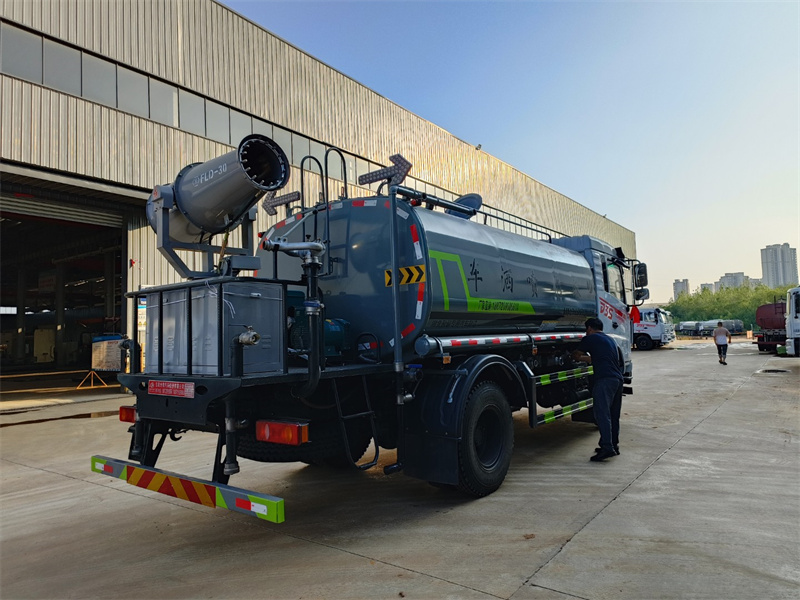 東風12噸霧炮灑水車產品標配前噴(鴨嘴)、后沖、后灑、側噴、后置式工作 平臺,平臺上配置綠化水炮(可 360°旋轉,既可以調成柱狀,也可 以調成霧狀,更可以調成直沖狀、大雨、中雨、小雨、毛毛雨),配 備優質大功率專用灑水泵(可自吸自排,可從河里或池塘抽水到罐體), 取力器,雜物過濾網,消防接口,自流球閥系統、取力器、球閥、濾網 均為國家標準產品,主管道加粗,法蘭墊、法蘭盤加厚,大通徑球閥。 整體具備性能優良安全可靠、效率高、流量大、維修方便等特點