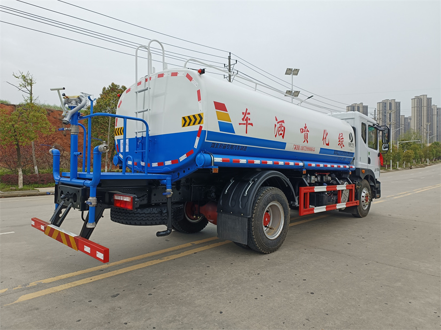 產品標配前噴(鴨嘴)、后沖、后灑、側噴、后置式工作 平臺,平臺上配置綠化水炮(可 360°旋轉,既可以調成柱狀,也可 以調成霧狀,更可以調成直沖狀、大雨、中雨、小雨、毛毛雨),配 備優質大功率專用灑水泵(可自吸自排,可從河里或池塘抽水到罐體), 取力器,雜物過濾網,消防接口,自流球閥系統、取力器、球閥、濾網 均為國家標準產品,主管道加粗,法蘭墊、法蘭盤加厚,大通徑球閥。 整體具備性能優良安全可靠,可以加裝電子水炮,氣動球閥,霧炮